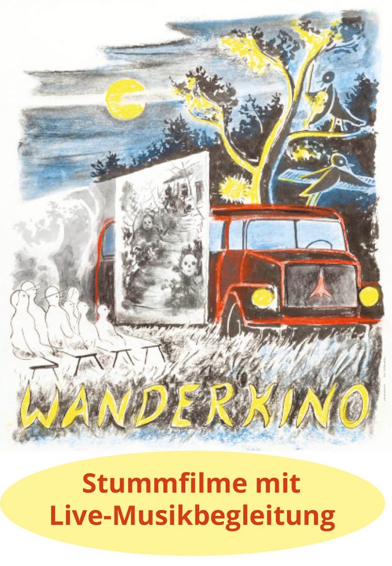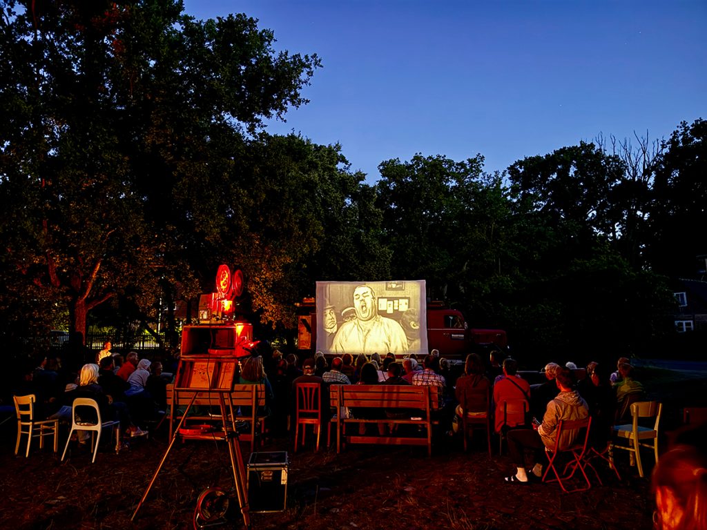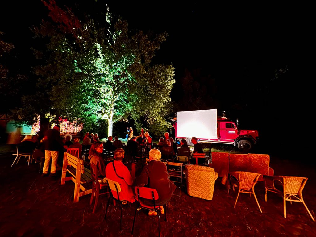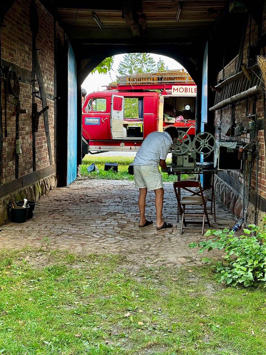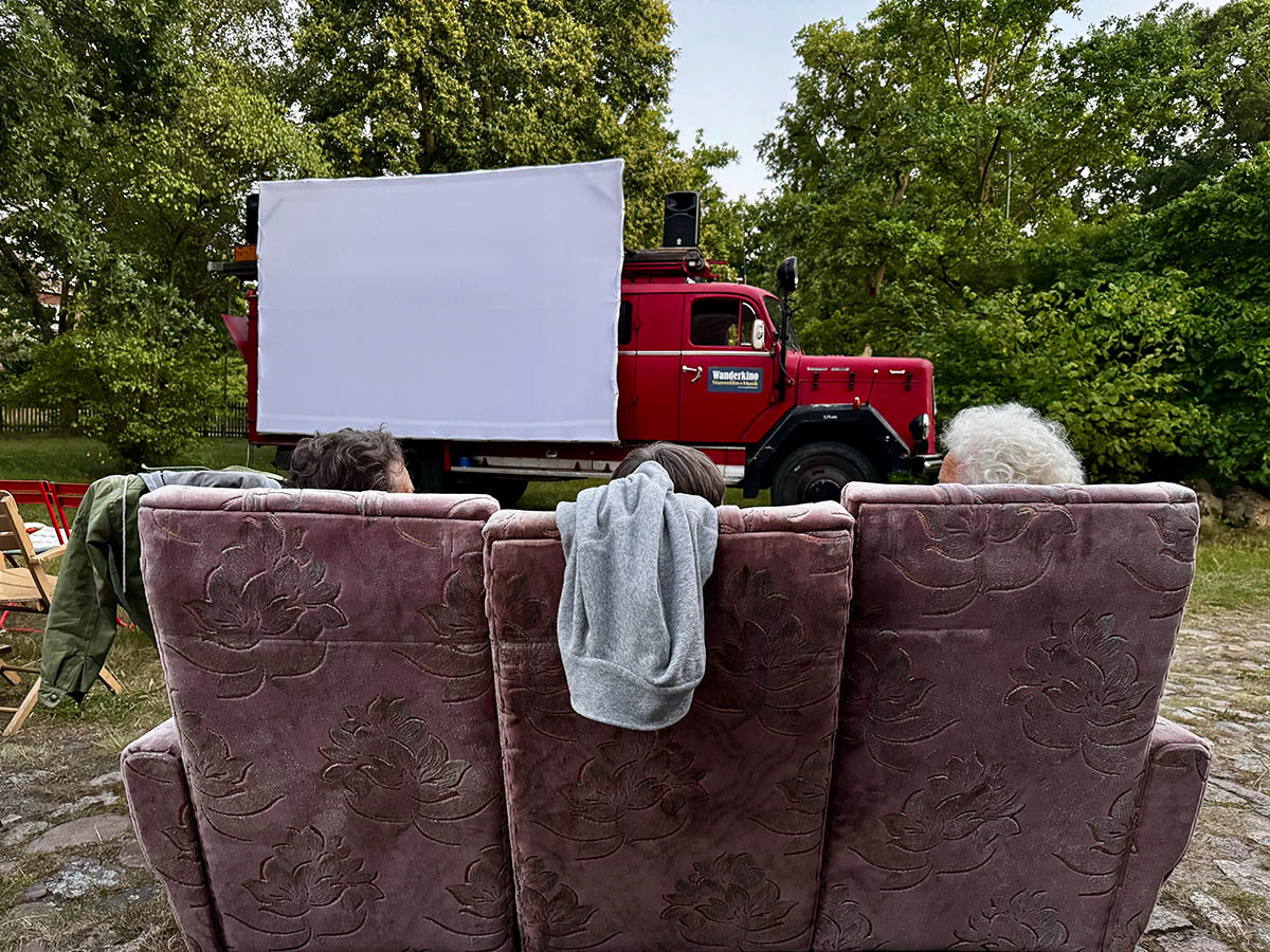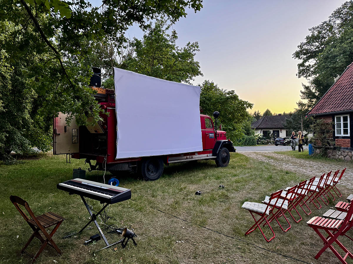 Der Musiker und Komponist Tobias Rank aus Leipzig besuchte uns mit seiner zum Wanderkino umgebauten Oldtimerfeuerwehr. Auf deren Leinwand projizierter er mit authentisch ratterndem Projektor ein Stummfilmprogramm und begleitete dieses live am Klavier. Die Musik fügte sich so gut, dass man den Pianisten über das so komplettierte Seherlebnis ganz vergass und sich erst bei seiner Verbeugung der Klasse der Darbietung bewusst wurde. Etwa siebzig große und kleine Nostalgiekinofans fanden den Weg nach Cacherien und freuten sich bei selbst gemachtem Popkorn und Getränken über den kurzweiligen und atmosphärisch so schönen Sommerabend.