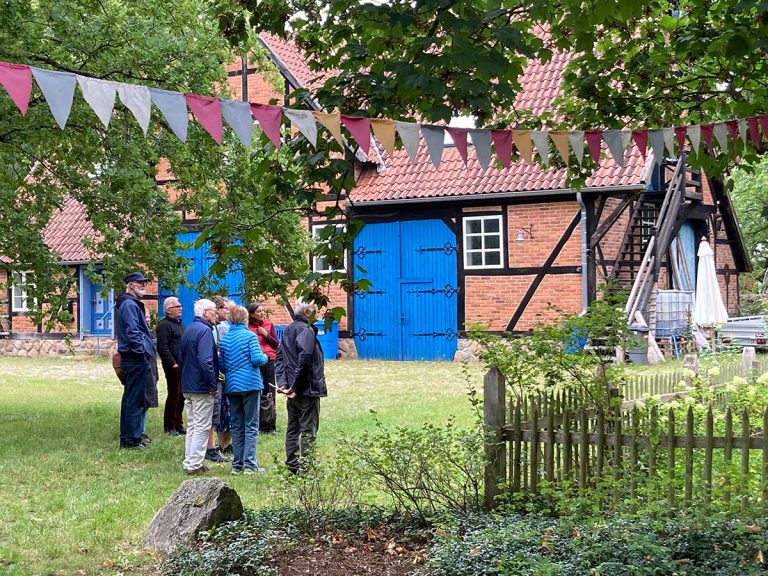 Zum bundesweit veranstalteten Tag des offenen Dankmals habe ich erstmals den Hof angemeldet.Immerhin sind hier einige bemerkenswerte Gebäude versammelt: Ein denkmalgeschütztes Zweiständer-Bauernhaus von 1665, das noch weitgehend in ursprünglicher Aufteilung und dem damit verbundenen Charme zu erleben ist. Dann die aus Gusborn abgebaute und mit einigen Änderungen wieder errichtete Dreiständer-Scheune, jetzt als Atelier und Lager genutzt. Die denkmalgeschützte Torscheune von 1718 wurde ebenfalls importiert aus Langendorf und hier an Stelle eines abgebrannten Torhauses etwas verkürzt wieder aufgebaut. Neben den beiden Einzeldenkmalen stehen alle Gebäude auf dem Grundstück unter Ensembleschutz. Das „Bienenhaus“ genannte kleine Lehm-und Fachwerkgebäude von 1910 dient unserer bunten Hühnerschar als Zuhause.