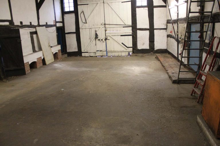 ist eine echte Werkstatt – sie hat jahrelang einen KFZ -Betrieb beherbergt. Das Gebäude, eine ehemalige Scheune, stammt von einem Hof aus dem Nachbarort. Der Vorbesitzer hat laut Dorfwissen in den 90 er Jahren zunächst eine Konstruktion mit Stahlträgern aufgestellt, um dann die Scheune darüber aufzubauen – das Fachwerkprinzip machte es möglich.