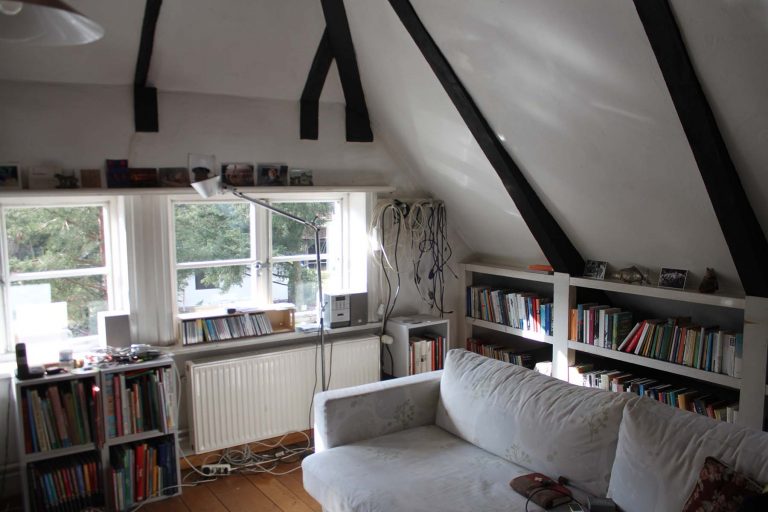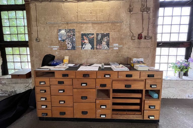Im ersten Stock, der sich einigermaßen heizen lässt, ist das Büro und das Atelier mit Materiallager eingezogen.