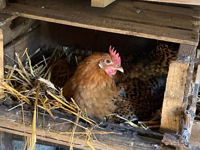 Nach der Gründung eines Hühnerkombinats mit fünf NachbarInnen ist im August 22 unsere bunte Hühnerschar ins Bienenhaus eingezogen und teilt sich den Platz mit Gartengeräten und Blumentöpfen. Das vorgefundene Oldtimerfahrrad hat einen neuen Standort am Gartenzaun bekommen, wo es allmählich Teil des Bewuchses wird.
