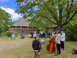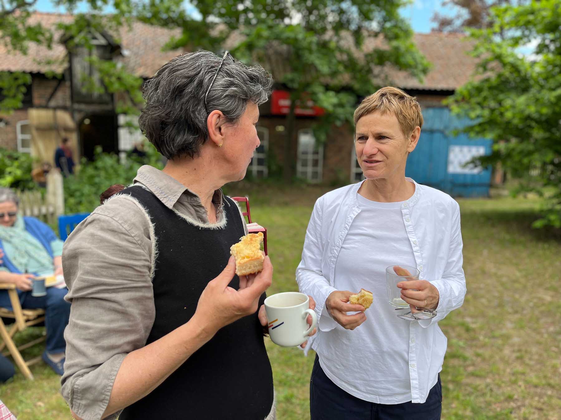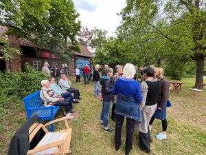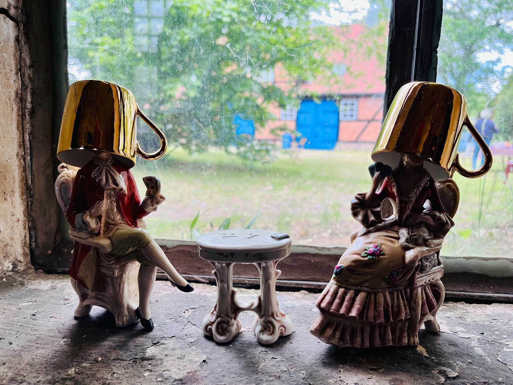 Clara und Team haben sich um den Betrieb des Hofkaffees gekümmert, das sehr gut angenommen wurde. Wir hatten an die 7oo Besucher*innen, die sich teils sehr begeistert zeigten. Viele waren erfreut, einen neuen „Wunderpunkt“ mit noch nicht gesehenen Ausstellungsstücken in einer sonst nicht sehr stark in die Kulturelle Landpartie eingebundenen Gegend zu finden. Wir haben zahlreiche nette Gespräche geführt und auch das eine oder andere Stück fand ein neues Zuhause. Die Teilnahme war allerdings extrem zeitaufwändig, so dass es vorerst bei diesem Aufschlag bleibt und wir uns zukünftig eher auf kleinere Formate konzentrieren werden.