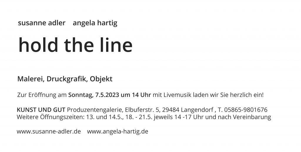 In ihren Acrylbildern entwickelt Susanne Adler (Lübeck) mittels Linien, Flächen, Streifen und Übermalungen Rhythmen und Farbklänge. Diese dokumentieren eine Spurensuche: Gesehenes, Gedachtes, Empfundenes wird verdichtet, aufgezeichnet. In ihren Farbradierungen wird das zeichnerische Element durch die geritzte Linie erweitert. Die samtige Farbaufweichung am Grat ergibt im Druck die besondere Wechselwirkung.